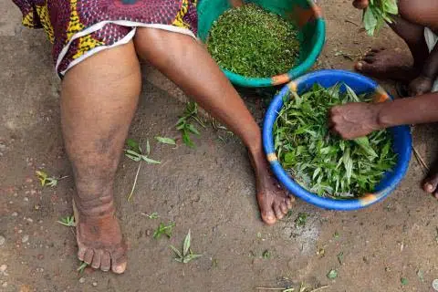 The very large swollen leg with folds of tough skin is characteristic of the later stages of the disease. This stage is commonly known as elephantiasis. In stage 6, knobs and mossy lesions that cause the swollen feet and legs to look almost like a tree trunk are present. By stage 7, the individual is no longer able to care for himself.